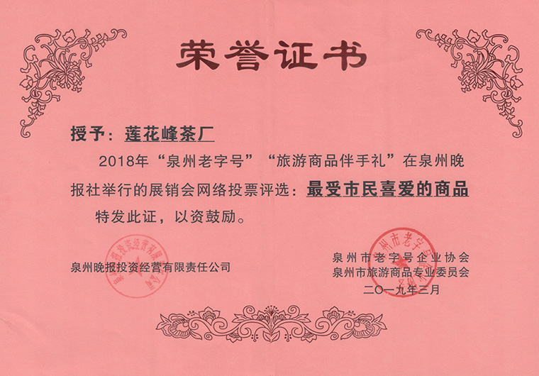 2019年3月福建南安市莲花峰茶厂被评选为泉州市“最受市民喜爱的商品” -